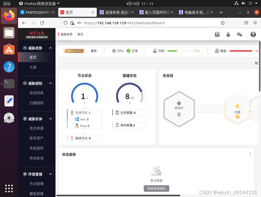 通过这个实验我们了解了蜜罐技术,蜜罐技术相当于是一个诱饵和陷阱,利用蜜罐可以获取到攻击者的IP地址,和他攻击的方法还有意图,这样有助于我们进行漏洞防护,有针对性地加强防护技术。这个实验我们简单的在ubuntu系统中部署了HFish蜜罐获取了kali进行扫描攻击时的行为,这个实验需要提前安装好数据库和开放好防火墙端口,实验相对来说比较简单,但也引起了许多反思,那么蜜罐就是万无一失的吗,如果蜜罐被攻破了怎么办呢,所以说日常的防护中我们还是多加注意。