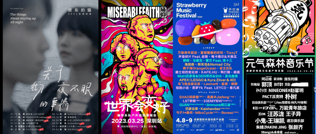 而受《我们民谣2022》《中国新说唱》等音综带动,今年独立歌手/乐队类演出也是全面开花。陈粒、房东的猫、艾热、黄旭等独立音乐人都开启了多城市巡演;乐队方面,从乐夏走出的痛仰、康姆士办起了乐队专场,草莓音乐节、元气森林音乐节等拼盘演出也在成都、盐城、宁波等地接连上演。