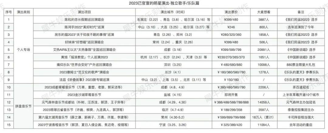 如果抢不到大明星的演唱会门票,独立音乐人或乐队相关演出正在成为当下很多人观演的替代选项。从今年全面复苏的态势来看,这块音乐市场也已经走向了大众化。(见下表)