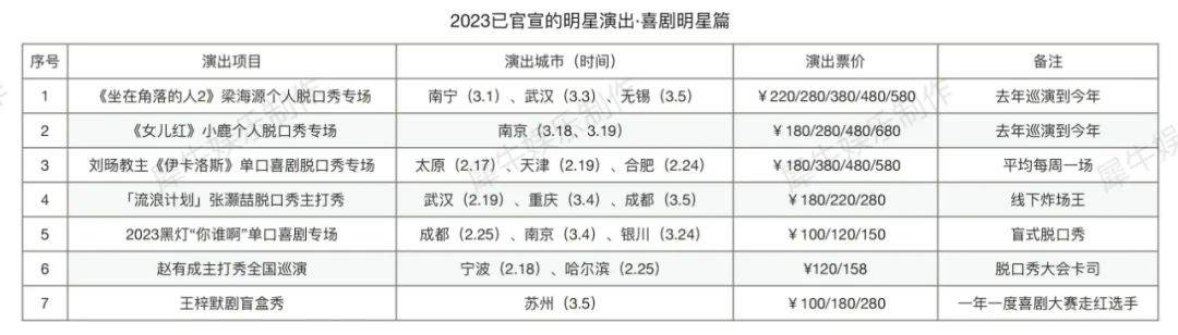 非音乐演出方面,全国话剧、舞剧、音乐剧、脱口秀、相声的排演和票价都基本恢复到疫情前状态,而票房号召力较强的梁海源、小鹿等喜剧明星,其个人专场票价都卖到了500+的水准,演出市场正展现出头部明星多元化、消费产品多样化的大趋势。