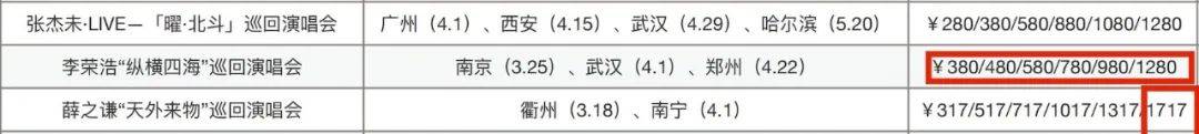 可以看到,今年这轮头部演唱会呈现出两大特征:一是票价回归到了疫情前水平,李荣浩演唱会卖出了¥380/480/580/780/980/1280的标准分档,而薛之谦演唱会的最高票价甚至卖到了1717元。