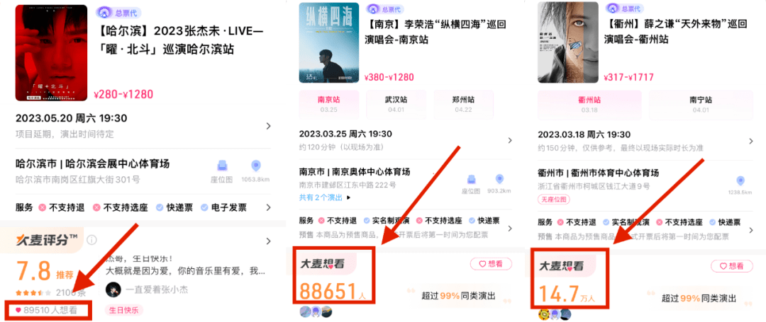 李荣浩的南京演唱会则出现了开售即售罄的情况,88651人的“大麦想看”昭示着该演出因何一票难求。而薛之谦这次虽然选在冷门城市“浙江衢州”开唱,该站的“大麦想看”却也一度飙升到了14.7万人。