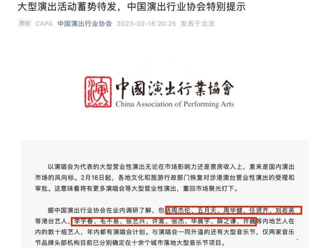 当然,目前已官宣的头部演唱会只是一部分。从中演协透露的消息可知,接下来周杰伦、五月天、周华健、任贤齐、刘若英、李宇春、毛不易、张艺兴、许嵩、华晨宇都将“排队”开唱。这些内娱重磅歌手的回归,或将彻底点燃2023演出市场的能量和热情。