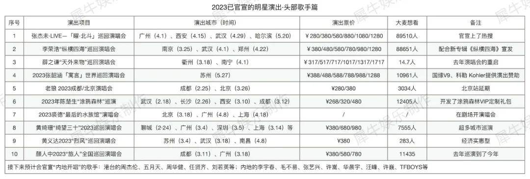 据犀牛君初步统计,2023目前已官宣的头部歌手演唱会超过了10个(如下表),而他们中有的是官宣即上热搜,有的是开票即告售罄,群众想看演唱会想疯了的心态尽显无疑。