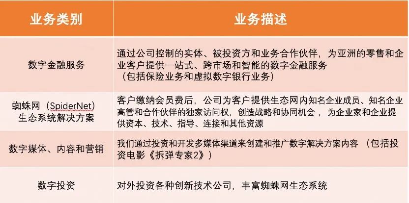 经过2019年的重整,尚乘数科主要业务分为四个板块,分别是数字金融服务、蜘蛛网生态系统解决方案、数字媒体、内容和营销,以及数字投资业务,其中贡献收入最大的还是蜘蛛网生态系统解决方案(以下简称“蜘蛛网生态业务”)。