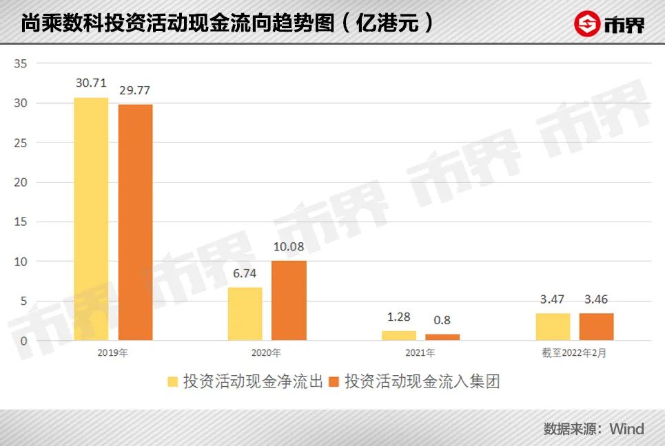 数据显示,2019年到2021年,尚乘数科均有大额的投资活动现金净流出,在1.28亿港元到30.71亿港元不等,其中绝大部分流入了控股方尚乘集团。