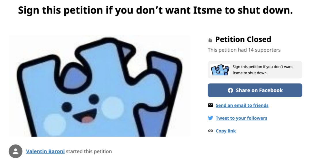 除了在社交媒体上的全力呼喊,甚至有用户尝试发起“请愿书”,要求开发者停止关停 Itsme,不过结果显示只有 14 名用户参与请愿。总之,Itsme 还是难抵消失在历史洪流中的结局。