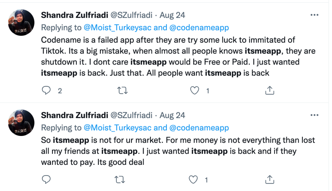 在宣布于 8 月 10 日关停后,曾经每天有将近 100 万分钟视频时长的 Itsme,在 App Store 和 Google Play 已经查无此 App,已经下载的应用已经无法打开、甚至就连 Twitter 账户内容也被全部清空,好像从没来过...