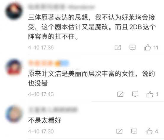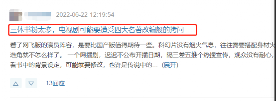 电视剧版的《三体》还没上线,豆瓣主页里就已经出现了3800余条评论,其中质疑和担心改编后毁掉原著的占主体。通过赞同数据可以看到,赞同这样评论的观众不在少数。