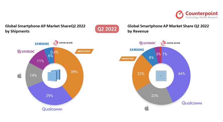 也正因此,2022年,众多智能手机厂商纷纷抛弃高通,转投联发科的门下。Counterpoint Research数据显示,2022年Q2,在全球手机芯片市场,联发科的市场份额为39%,同比增长6%。