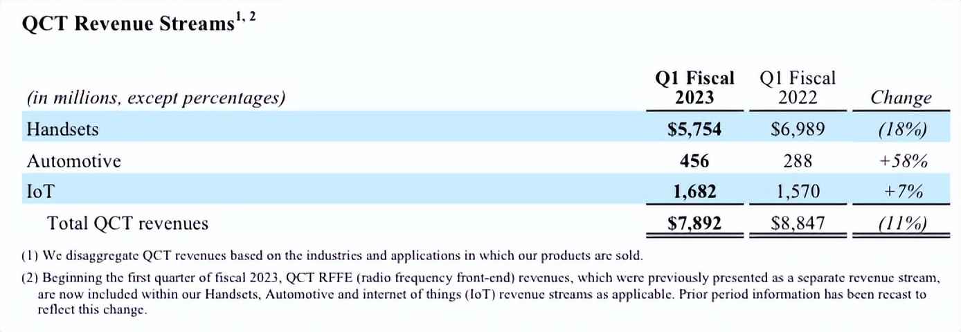 其实随着智能汽车、IoT等产业的发展,高通也开始积极布局相关业务。2023财年Q1财报显示, 高通芯片业务QCT下的汽车业务以及物联网业务营收分别为4.56亿美元、16.82亿美元,分别同比增长58%、7%。