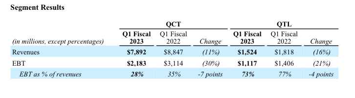 高通业绩增速放缓,与芯片业务QCT和技术许可部门QTL两大业务线不景气有直接的联系。2023财年Q1,高通芯片业务QCT营收78.9亿美元,同比下降11%,其中手机芯片营收57.5亿美元,同比下降18%;技术许可部门QTL业务营收15.2亿美元,同比下降16%,该部门营收的主要来源是收取蜂窝专利使用权。