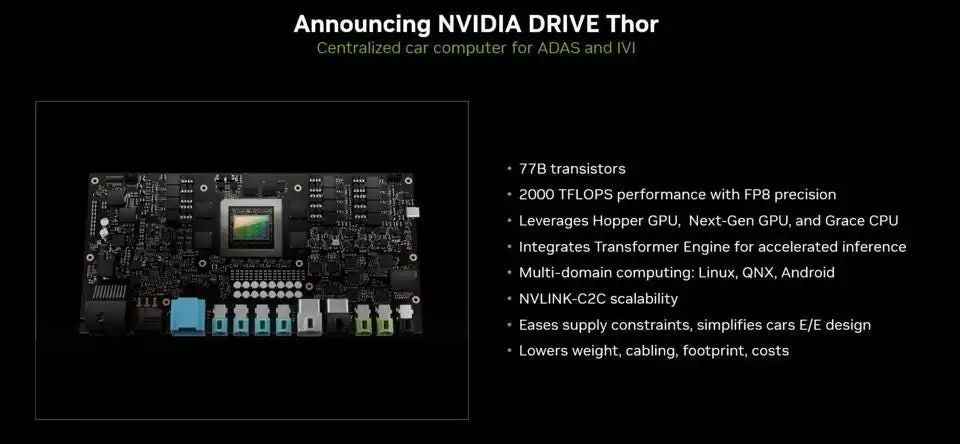 比如,英伟达在GPU赛道居于领先位置,凭借这种得天独厚的资源,其可以驾轻就熟地推出具备核心竞争力的自动驾驶芯片。2022年9月,英伟达公布了新一代“DRIVE Thor”计算平台,最高算力达2000 TOPS,是Orin芯片的8倍。