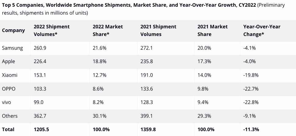 IDC披露的数据显示,2022年,全球智能手机出货量为12.1亿台,同比下跌11.3%,创2013年以来的最低记录。在财报电话会上,高通首席执行官克里斯蒂亚诺·阿蒙对2023年智能手机市场持有更悲观的看法。
