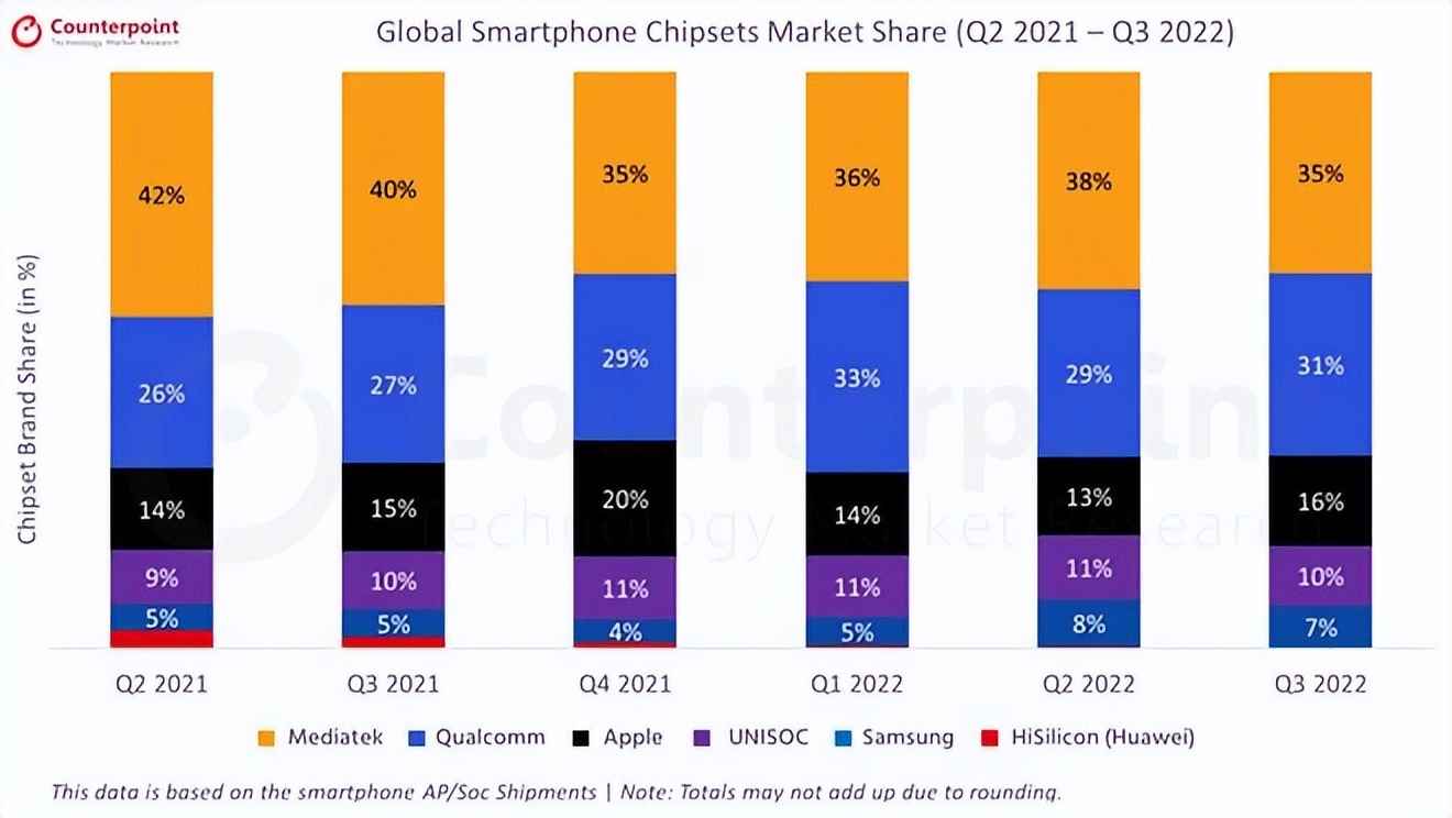 一方面推出了更稳定的高端处理器,另一方面,将此前的高端产品中端化,高通终于稳住了市场份额。Counterpoint Research数据显示,2022年Q3,高通的市场份额环比提升3%至31%,反观联发科的市场份额则下跌3%。