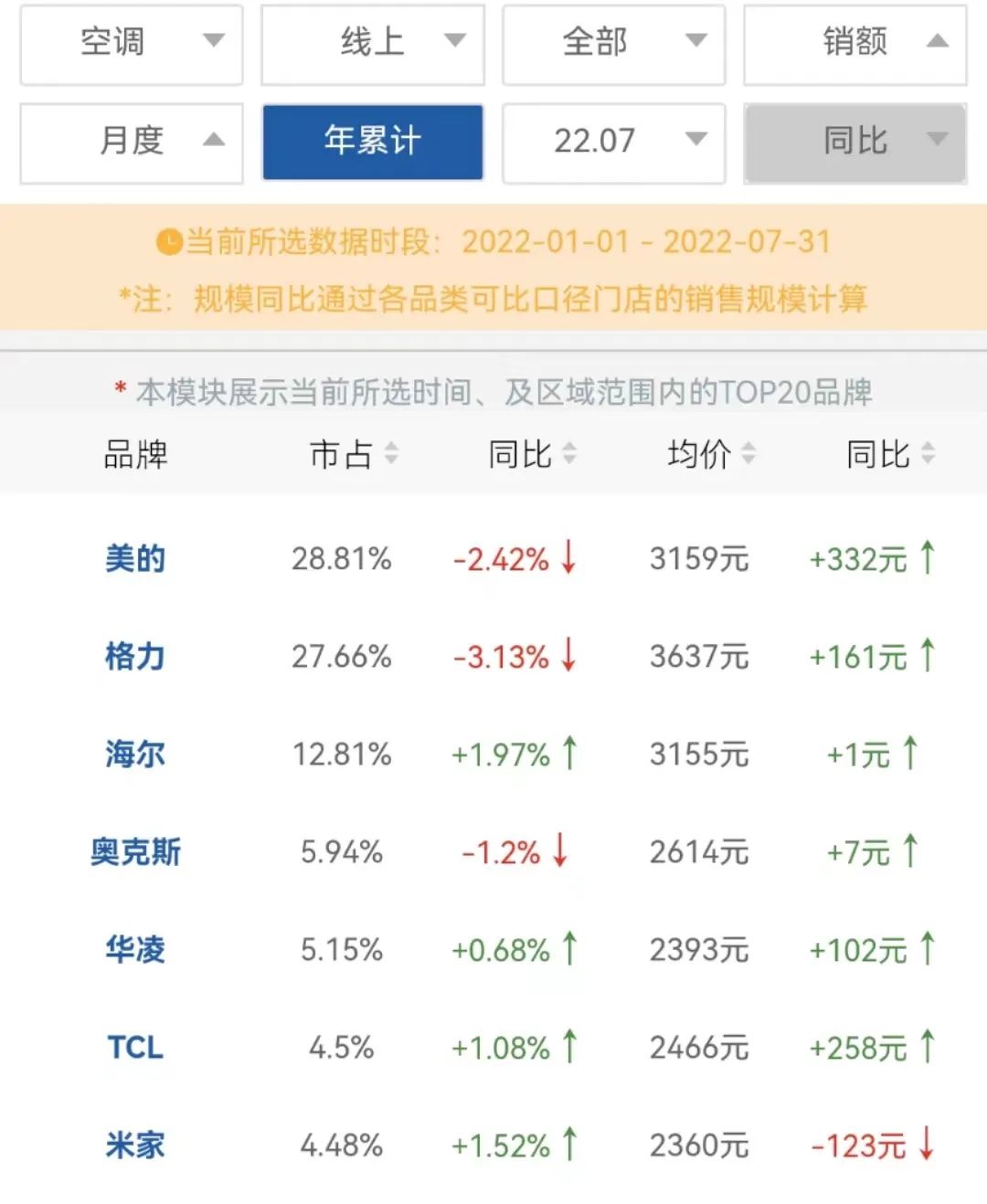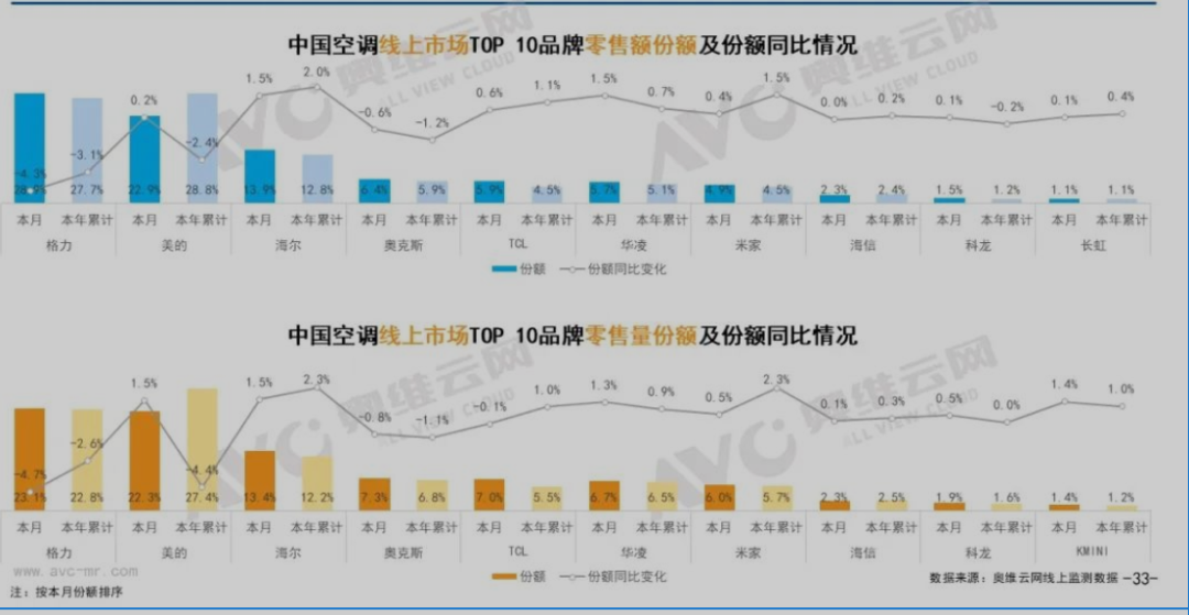 (中国空调线上市场TOP 10品牌零售量份额及份额同比情况 图源:奥维云网)