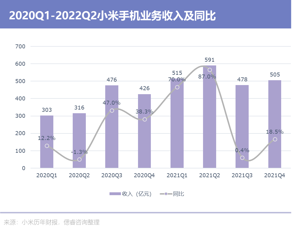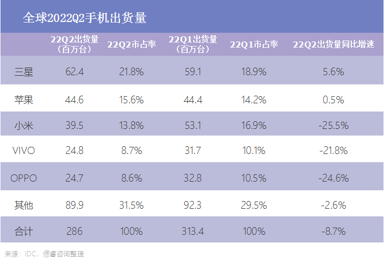 三个业务全部负增长,单拉主营业务手机业务来看,小米2022Q2手机全球出货量同比减少25.5%,可以说是非常惨淡。
