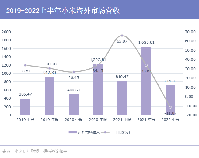 国内增长不给力,而占据小米整体收入一半,更具有想象空间的海外市场也不好混。在2022Q2营收340亿元,同比下滑22%。