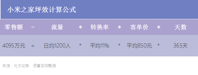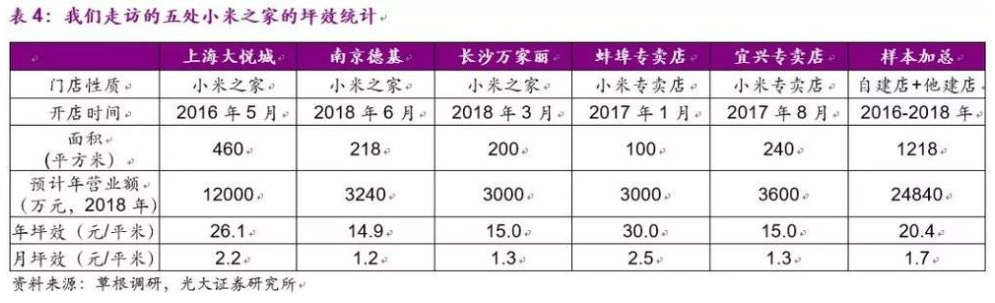 (走访的五处小米之家的坪效统计 图源:光大证券)