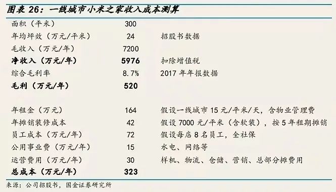 (一线城市小米之家收入成本测算 图源:国金证券研究报告)