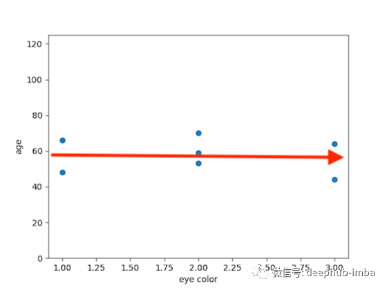 在上一个散点图中,我们看到一些点没有明显的斜率。该相关性的r值为-0.126163。年龄和眼睛颜色之间没有显著的相关性。这也应该说得通,因为眼睛的颜色不应该随着孩子长大而改变。如果这种关系显示出很强的相关性,我们会想要检查数据来找出原因。