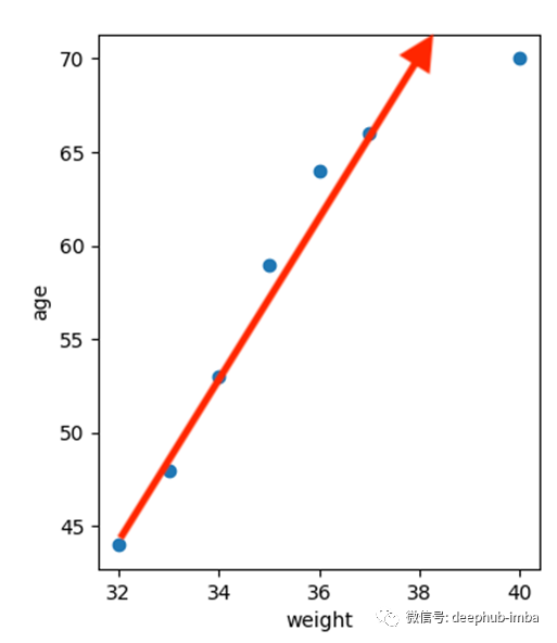 当我们观察年龄和体重之间的相关性时,图上的点开始形成一个正斜率。当我们计算r值时,得到0.954491。随着r值如此接近1,我们可以得出年龄和体重有很强的正相关关系的结论。一般情况下,这应该是正确的。在成长中的孩子中,随着年龄的增长,他们的体重开始增加。