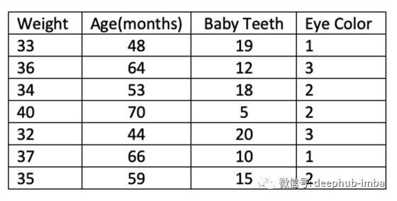 它具有以下列,重量,年龄(以月为单位),乳牙数量和眼睛颜色。眼睛颜色列已分类为1 =蓝色,2 =绿色和3 = 棕色。