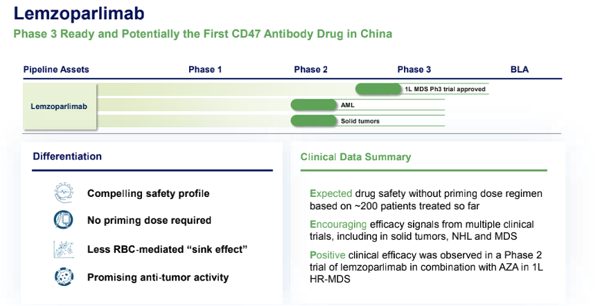 在JPM大会期间,天境生物表示,其靶向CD47的来佐利单抗,一线治疗骨髓增生异常综合征的三期临床试验已获药监局批准,将于今年启动。若不出意外,来佐利单抗可能成为首个获批上市的国产CD47单抗。