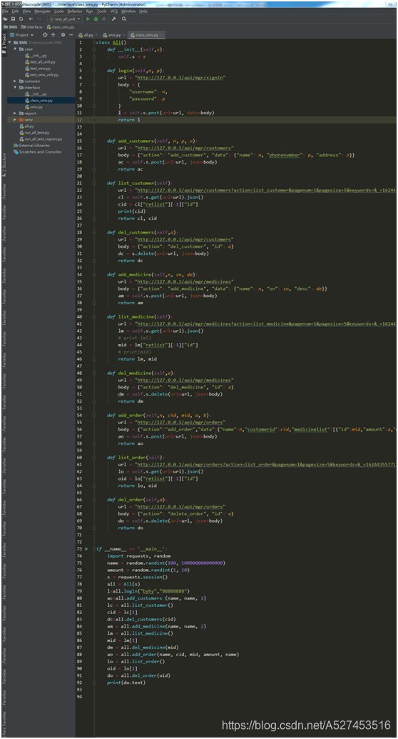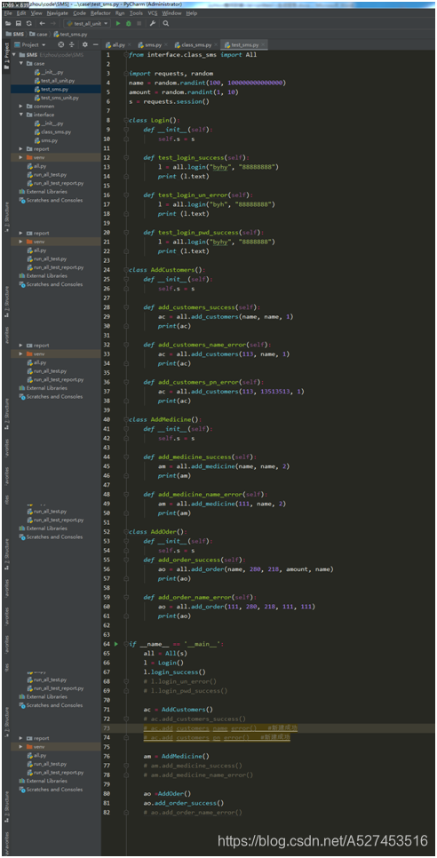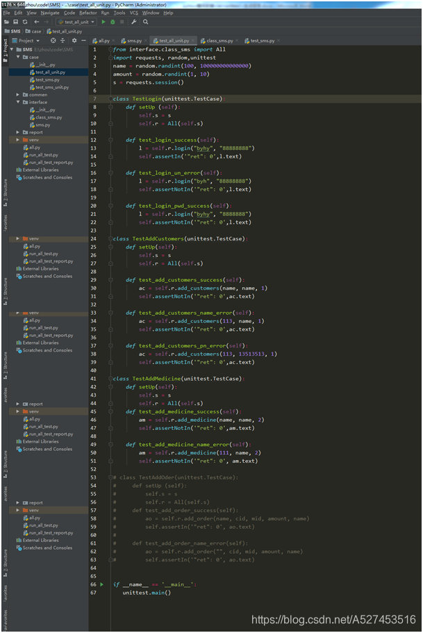 5、到这里整体接口封装好了,可以导入unittest模块让python自动执行测试用例,可以在case命名的package中编写测试用例方法,一个方法就是一条用例,然后方法的命名需要有可读性,比如测新增客户的,可以使用test_add_customers_success()来命名,这样一看就知道这条用例的测试点是什么了。unittest框架的主要作用是帮助我们一键批量执行以test开头的测试用例方法,进行断言,生成html测试报告。