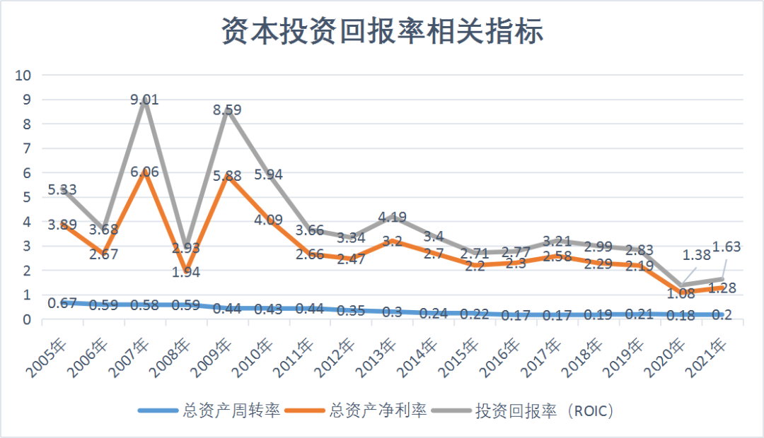 我们从财务的角度来分析复星的产业是否能有足够的协同作用。从下图我们可以看出,无论是反映营收和资产投入关系的总资产周转率,还是反映利润和资产投入关系的总资产净利率和投资回报率,都是呈下降模式。