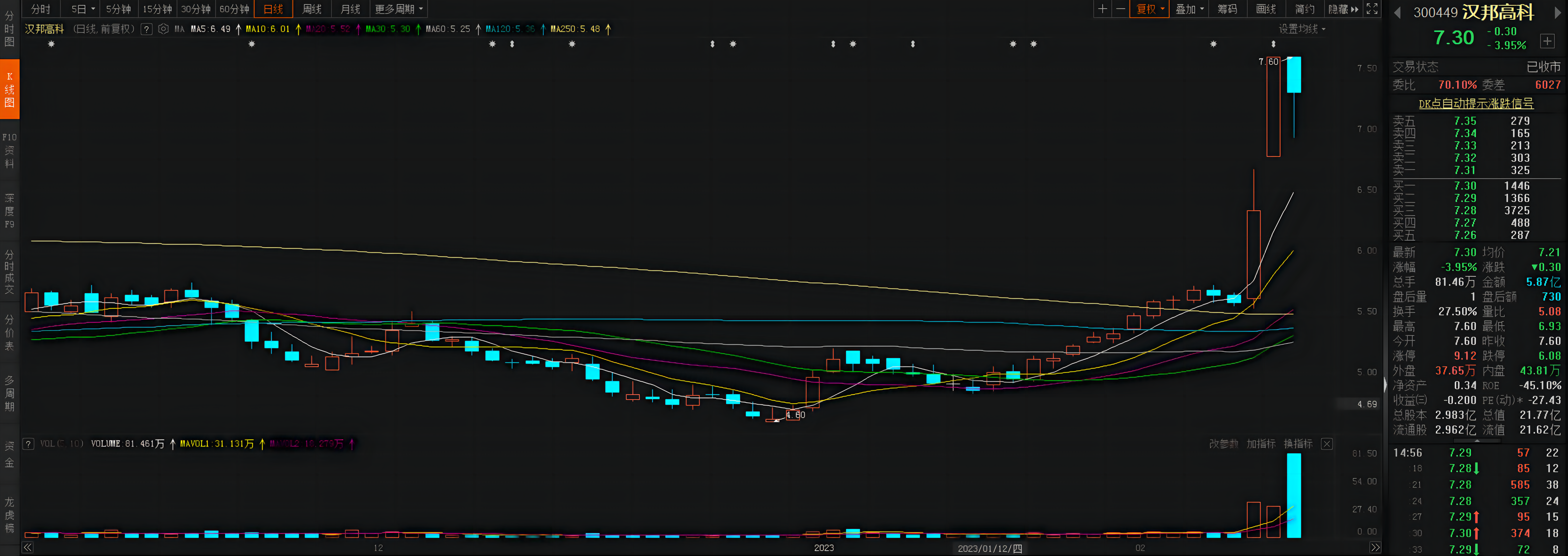 不过概念板块经过周末消息面发酵,今天整个数字水印板块早盘领跌,整体呈现调整态势,作为龙头的汉邦高科自然也不能独善其身,截至收盘,跌幅达3.98%,总市值21.77亿元。