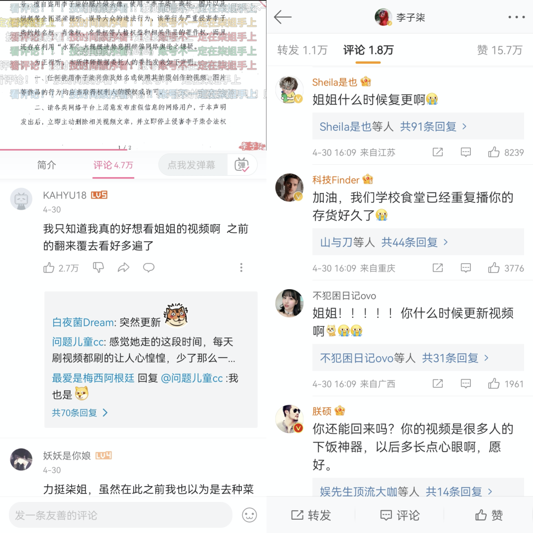 在内容平台上,李子柒最新动态是今年4月30日发出的律师声明,而在YouTube上,她的内容更新停留在2021年7月14日。