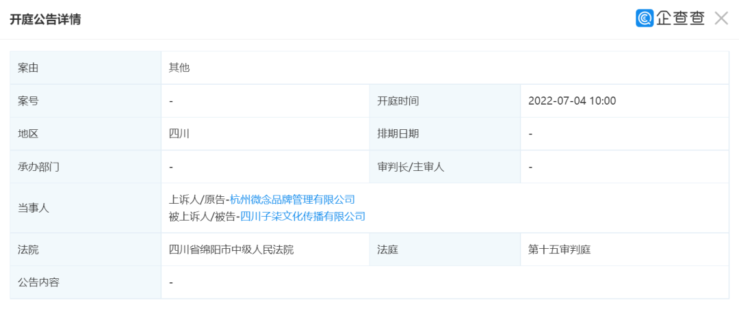 在李子柒“消失”近一年后,大家又将视线集中在了她身上——7月4日,杭州微念品牌管理有限公司与四川子柒文化传播有限公司的相关案件在四川绵阳市中级人民法院开庭。