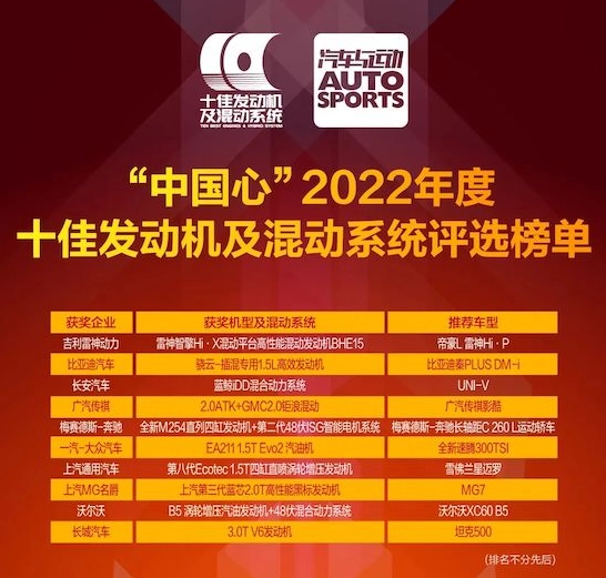 (中国心2022年度十佳发动机及混动系统评选榜单 图源:汽车与运动)
