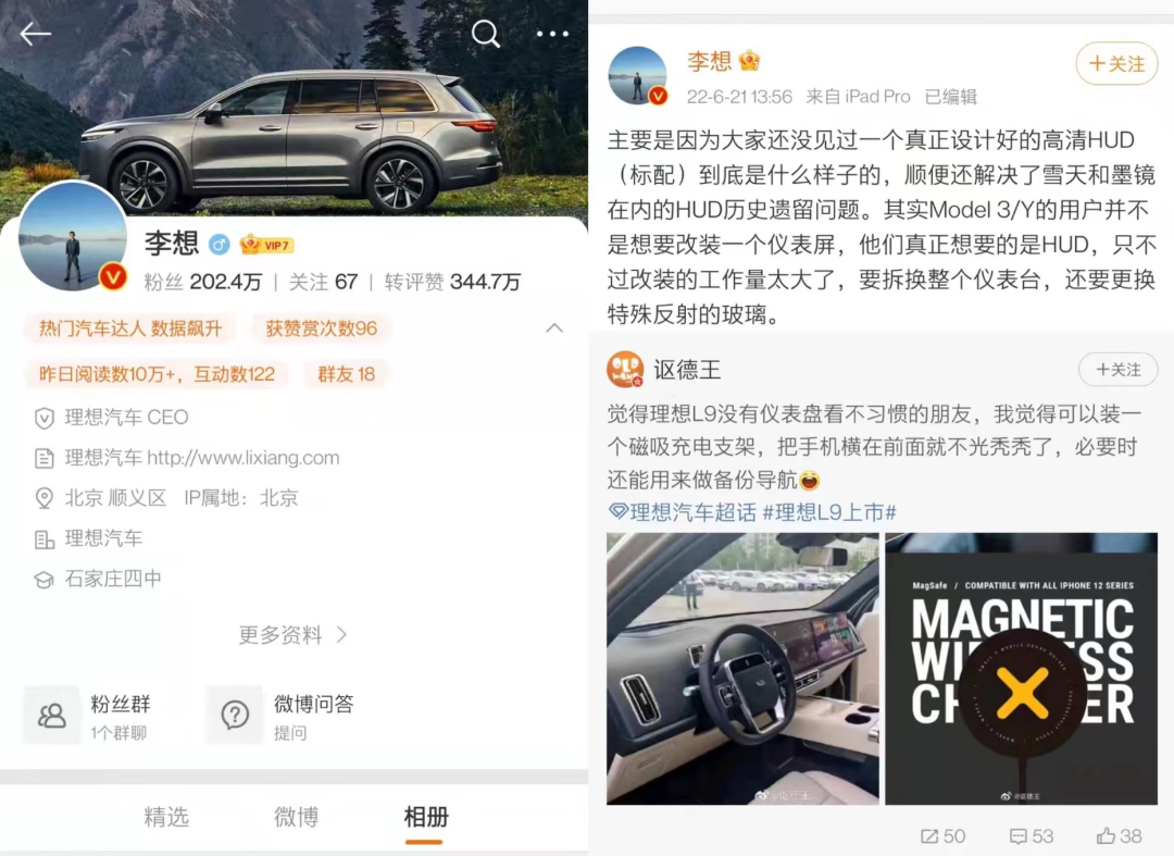 比如,李想乐于将L9的设计思路分享给消费者,如L9为什么舍弃仪表盘配置;小鹏汽车创始人何小鹏也曾因为源代码技术纠纷怒怼特斯拉“你要有思想准备被我们打的找不到东。”
