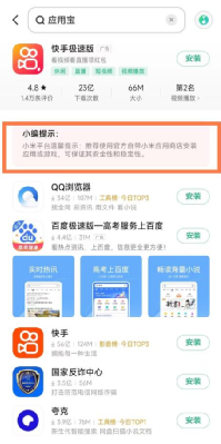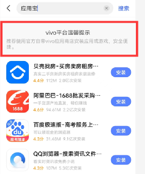 比如用vivo的应用商店搜索“应用宝”,发现根本没有,还会被“温馨提示”使用自带的才安全便捷。