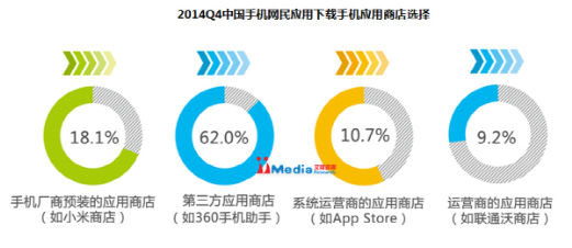 2014年Q4中国手机网民应用下载手机应用商店选择(数据来源:艾媒咨询)
