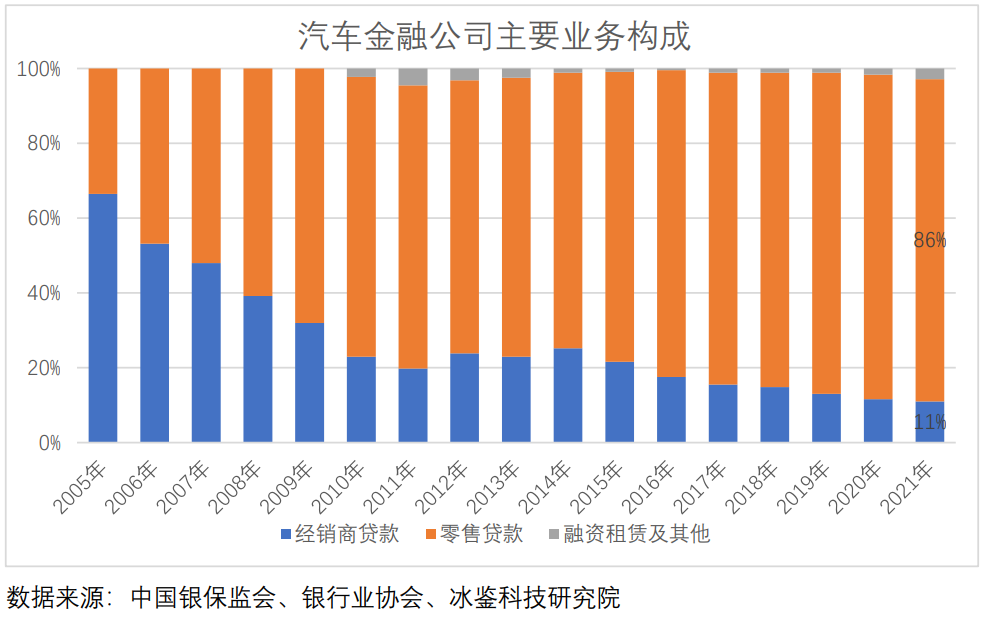 在金融服务方面,汽车金融公司主要聚焦于本品牌汽车零售金融,目的是促进汽车厂商新车销售。据统计,目前零售贷款余额已经超过八五成,而经销商贷款余额从2005年的60%以上下降到2021年的11%左右,融资租赁及其他业务则几乎可以忽略不计。