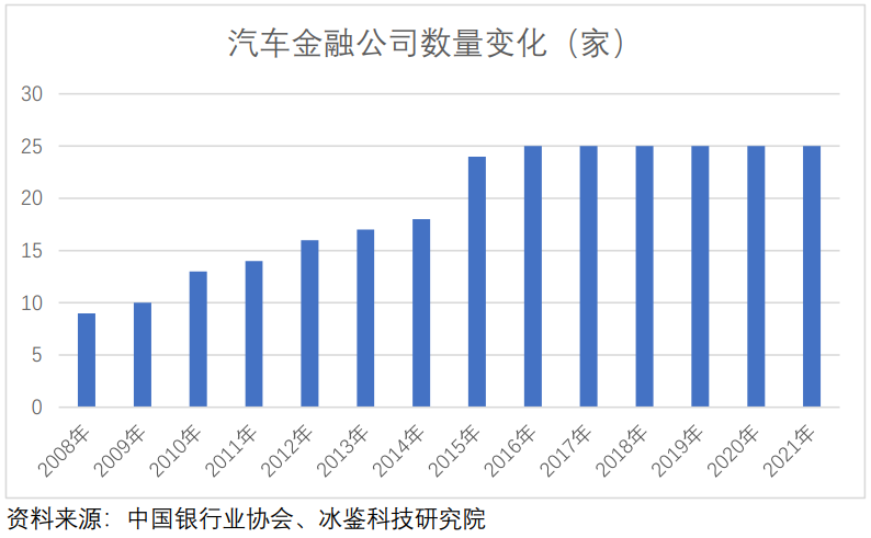 本文所称汽车金融公司是指由银保监会批准设立,为中国境内的汽车购买者及经销商提供金融服务的非银行金融机构,以区别于汽车融资租赁公司及开展互联网汽车金融业务的平台。持牌汽车金融公司处于稳步发展阶段,受制于疫情及整体汽车销量见顶,该行业发展已露疲态: