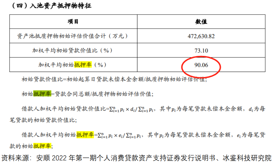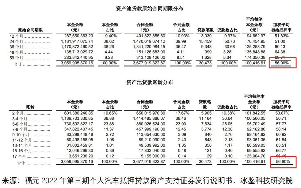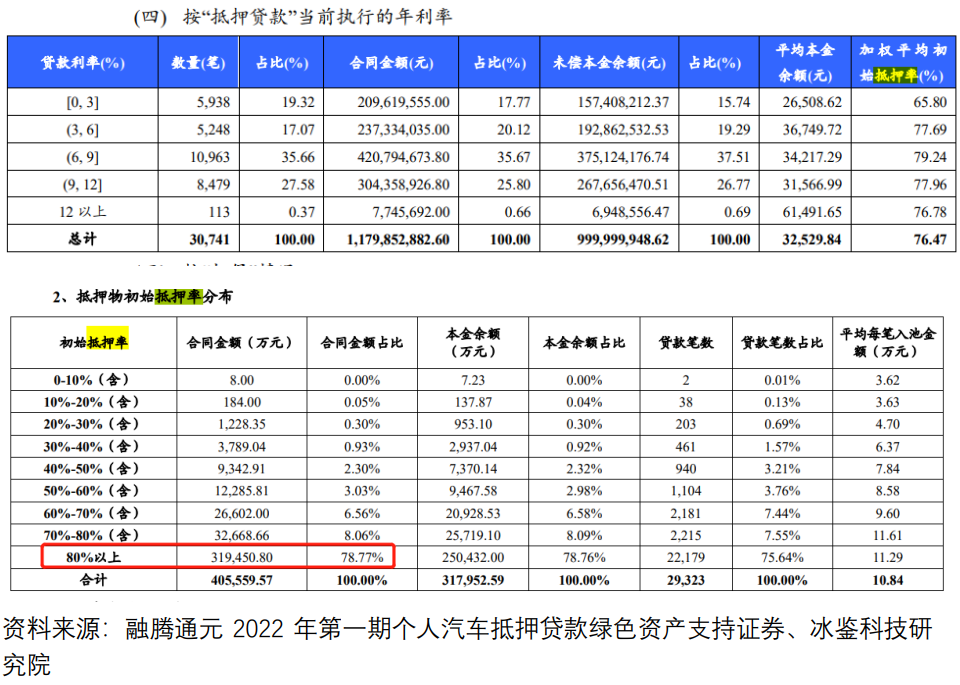 据平安银行的“安顺2022年第一期个人消费贷款资产支持证券”发行说明书披露,该产品的汽车抵押贷款加权平均初始抵押率高达90.06%,兴业银行某款汽车贷款产品资产中,近八成的贷款初始抵押率超过80%,远高于汽车金融公司行业50%-60%的抵押率。