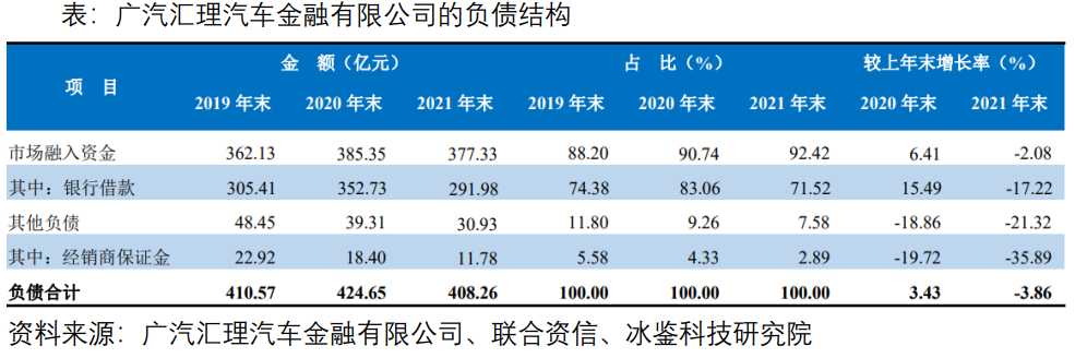 如广汽汇理汽车金融有限公司的负债主要还是银行短期借款,其中2021年银行借款291.98亿元,占负债总额的71.52%。