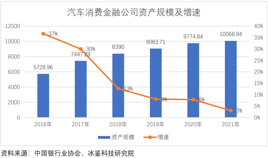 汽车金融公司虽然自2016年以来数量没有增加,但总资产依然保持增长,并于2021年突破万亿元大关。值得注意的是,汽车金融公司总资产增速在持续下降,从2016年的37%下降到2021年的3%。