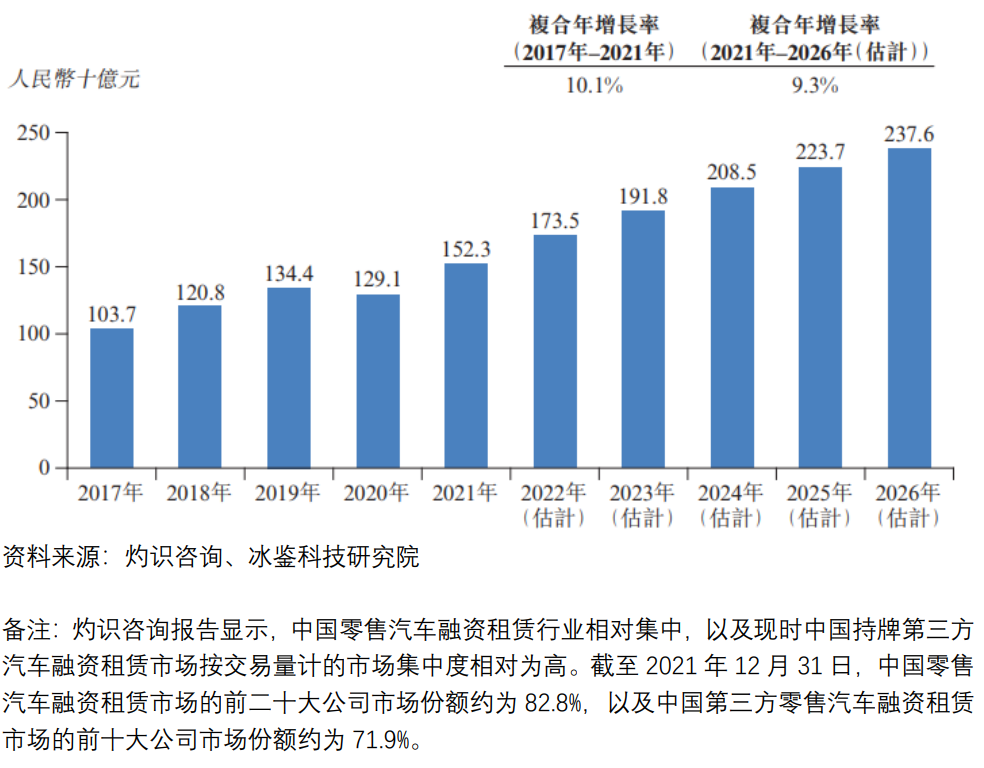 除了银行外,融资租赁公司也在持续发力。据统计,到2021年末,汽车融资租赁和经营租赁合同余额合计2500亿,其中融资租赁市场规模已达1500多亿。此外,汽车融资租赁近五年一直保持10%以上增速,预计2021年-2026年的复合增长率9.3%,是2021年汽车金融公司总资产增速的三倍。