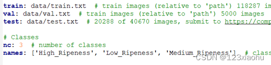 在yolov5目录下的data文件夹下新建一个apple.yaml文件,用来存放训练集、验证集、测试集的划分文件,目标的类别数目和具体类别列表。