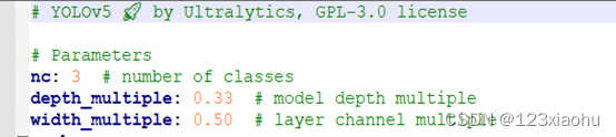 接着在models目录下的yolov5s.yaml文件进行修改,这里取决于你使用了哪个模型就去修改对于的文件,该项目中使用的是yolov5s模型。需要修改的参数仅有一个,就是具体类别的数目: