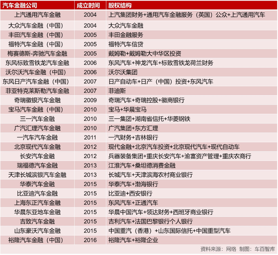 25家汽车金融公司成立时间及股权结构