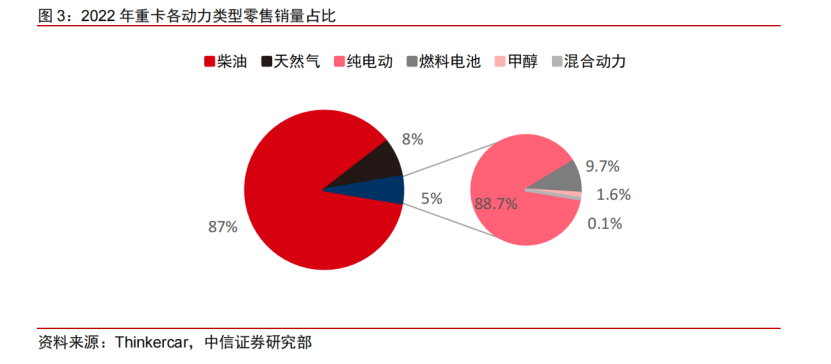 从动力类型来看,现阶段,重卡仍以柴油为主。2022年柴油重卡占比87%,天然气重卡占比8%,新能源重卡占比5%。