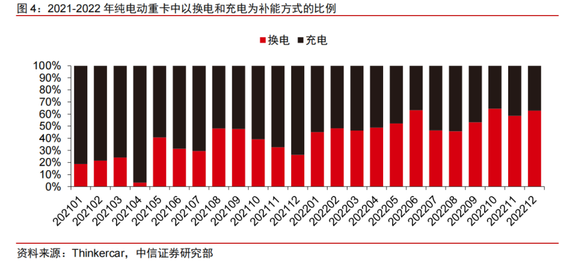 从补能方式来看,乘用车主要依赖于充电。而纯电重卡,充电和换电各占一半。并且,换电重卡占比有提升趋势。