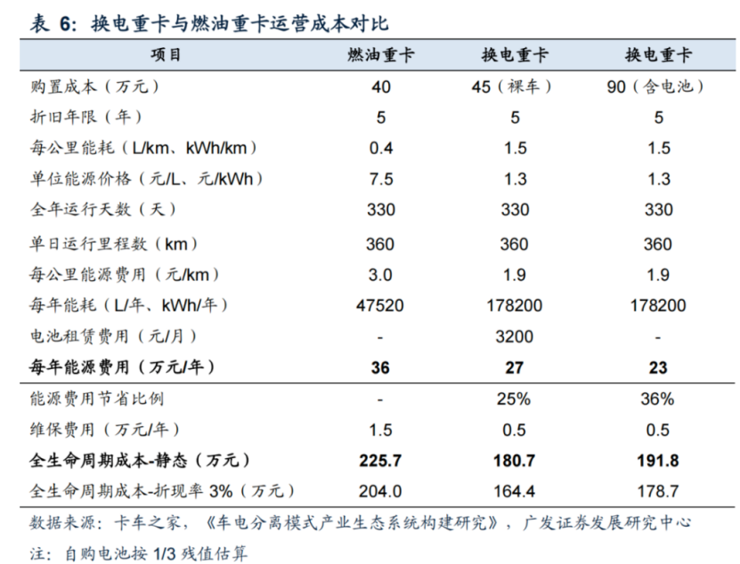 广发证券估算,按照通常情况下日均往返3趟,每趟120km的行驶里程测算,5年生命周期内换电重卡比燃油重卡总能费用节省约1/3左右,每年能源费用节省超10万元。若按全生命周期静态成本比较,换电重卡总成本较燃油重卡约低25万元以上。