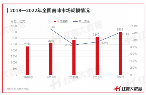 卤味赛道的发展势头持续向好,市场规模进一步扩大。《中国卤味品类发展报告2022》显示,2022年卤味的市场规模估计为3526亿元,增长幅度约为12.3%。